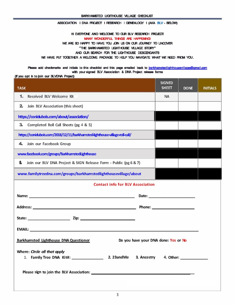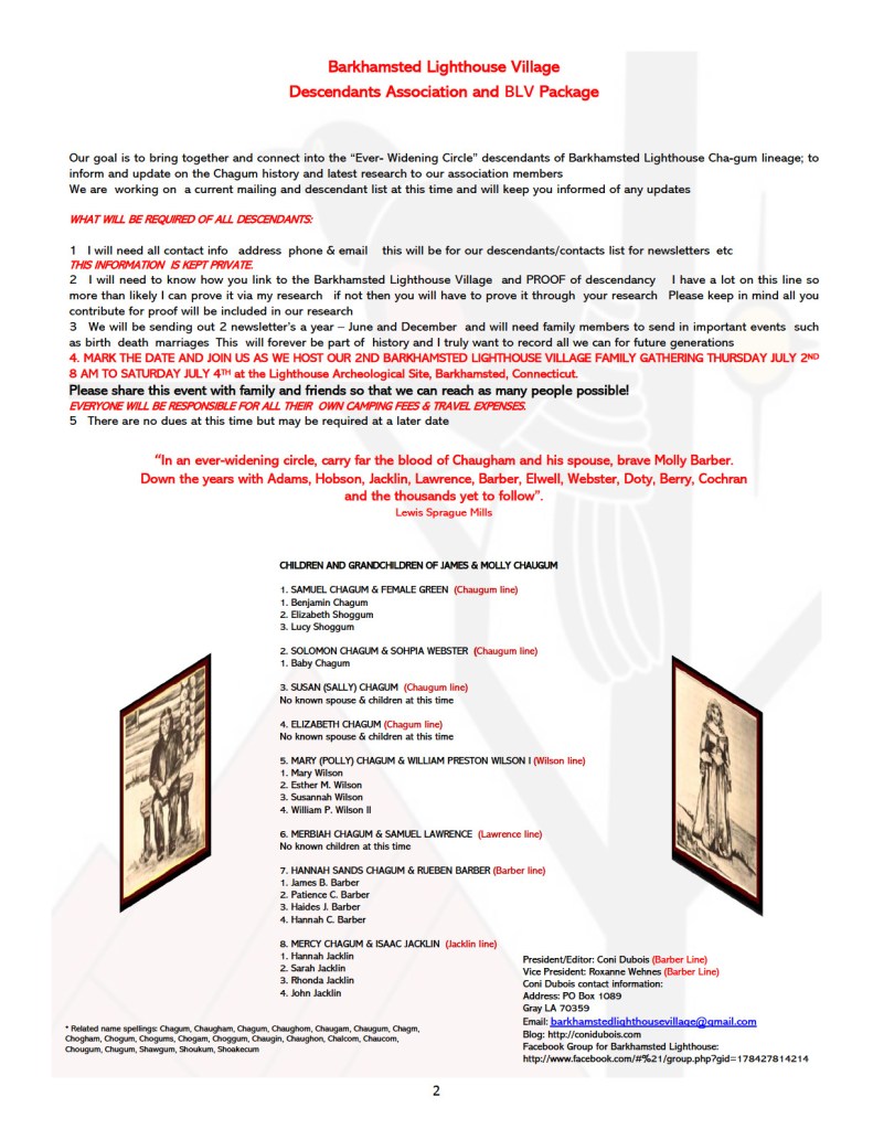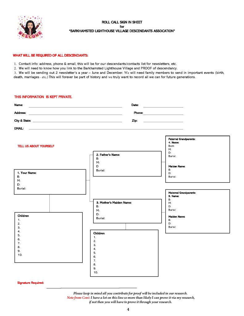 3. I will need to know how you link to the Barkhamsted Lighthouse Village and PROOF of descendant, I have a lot on this line, so more than likely I can prove it via my research – if not, then you will have to prove it through your research. Please keep in mind all you contribute for proof will be included in our research.