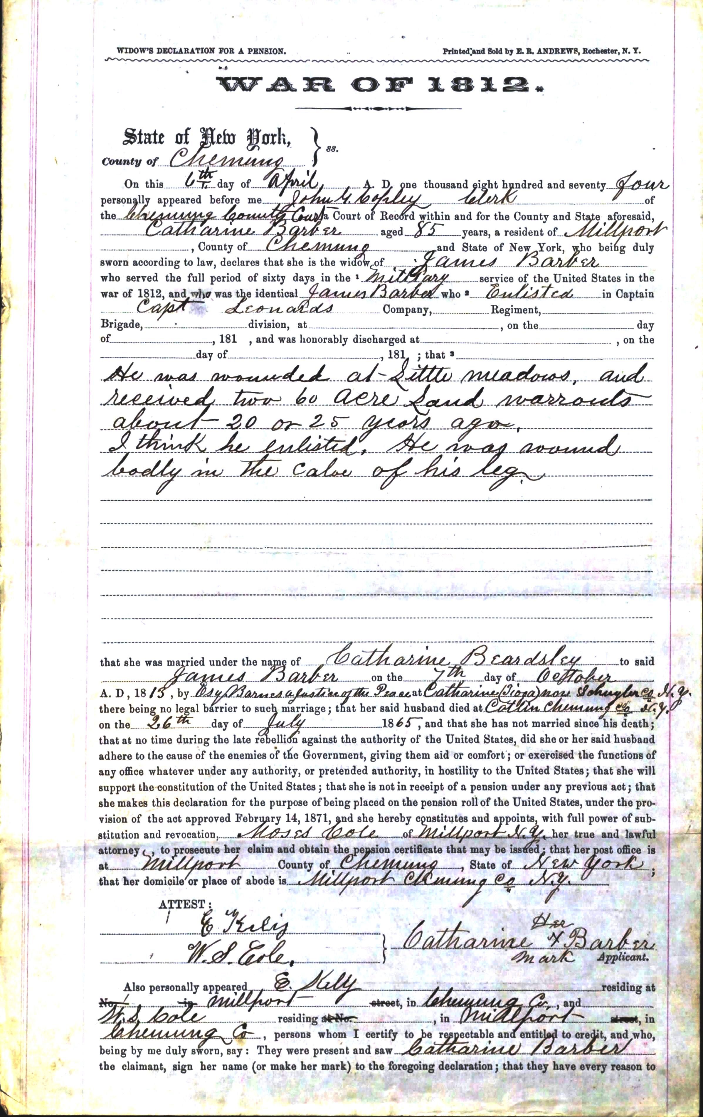 20433 – 160 – 50 While in the war of 1812 he was wounded – he had a chunk taken out of his leg below the knew in the meaty part – had stone removed & also couple of years later he was disabled and lost growth in the leg – had complications thru out life~ Widow Pension File notes for Catherine Barber Residence of Widow: 1874 Millport, Chemung Co. NY