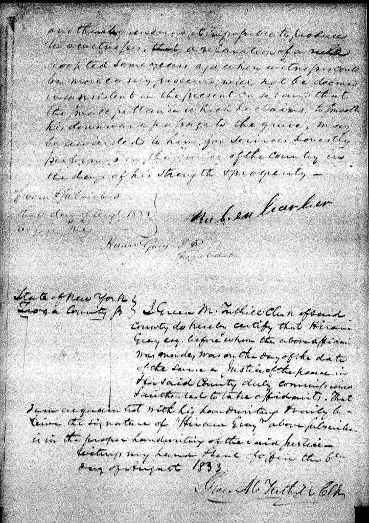 Reuben Barber of the Town of Catlin in the said County of Tioga being duly Sworn deposeth and saith that since he has learned through his ajent that the officers of the War Department who have in charge the excretion of the Pension act of June 7, 1832 have rejected him to prove his service as detailed in his application for pension under that act by two credible witnesses he has spent much time in traveling thorough “The Militan tract,” in the Stat of New York which many of the Revolution Soldiers were located in search of individuals with whom he served in the war of Revolution That he has been to the Town of Dryden in the Con__ ___ _______ where he aforesaid to have found Joseph Mead who served with him, but ascertained that he died a short time since. That he has also been to the town of Covert (?) in the County of Seneca where one Joseph Thomas who also served with him, lately lived but learning that he too was dead ” that he also has been to the town known of Fayette in Seneca County where Davis Cook who served with him, lately lived but ascertained that he removed about two hears since to the westward – but where he could not learn. The the only person living so far as he can learn that can testify in regard to his services is Jonas Yourmans of the County of Steuben, whose affidewit is affixed to his declaration – Having thus done all in his power to meet the requisition of the War Department without effect, he submits his cease to, in the hope that as death has made such savages of the relics of the Revolution (Pg2) and thinks ____ it improbable to produce two witness, and certain of a null ——