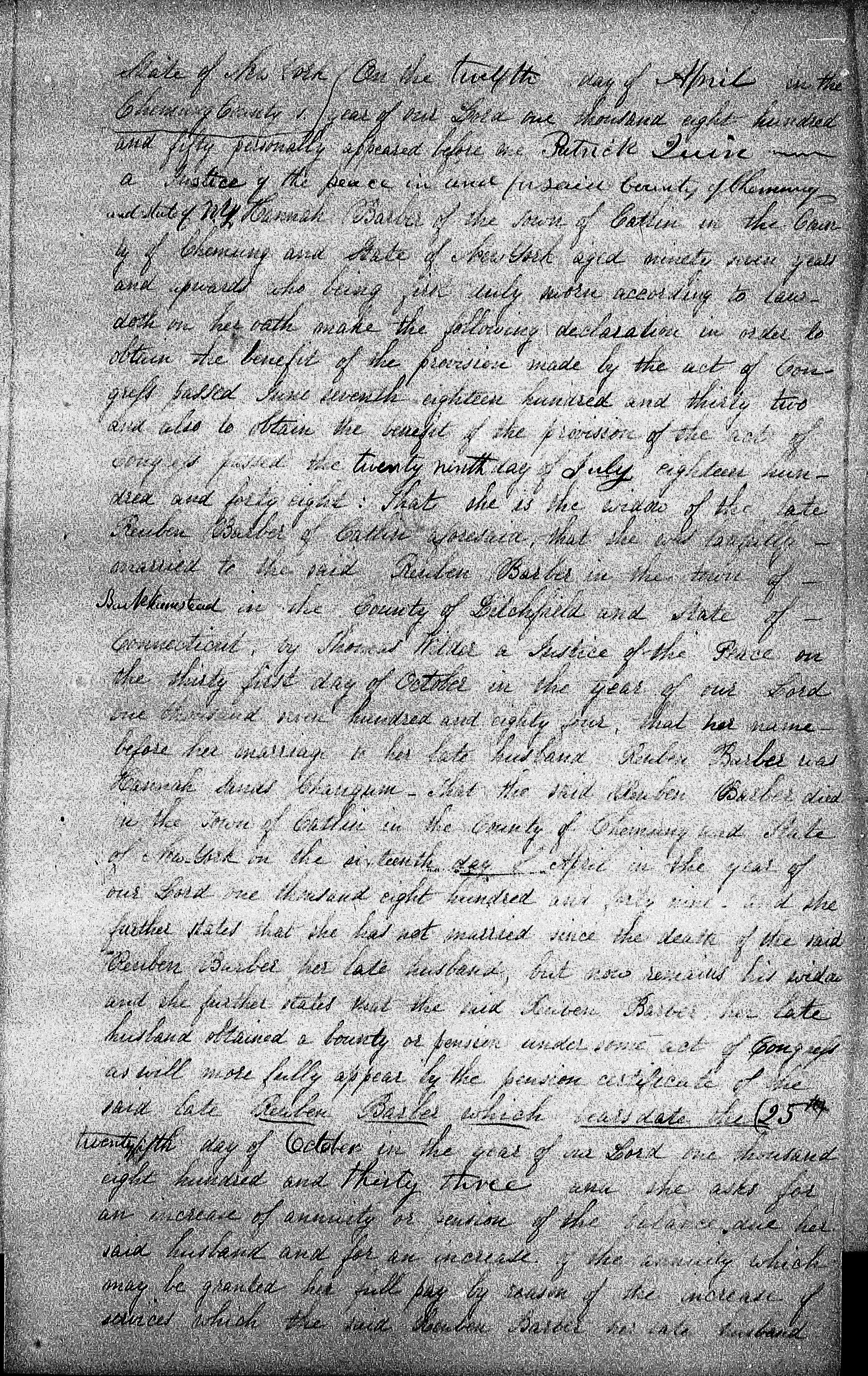 On the twelfth day of April in the year of our Lord one thousand eight hundreed and fifty personally appeared before me Patrick Quin a Justice of Peace in and forsaid County of Chemung in the State of NY Hannah Barber of the town of Catlin in the County of Chemung and State of New York aged aged ninety seven years old and upwards who being first duly sworn according to law doth on her oath make the following declaration in order to obtain the benefit of the provision made by the act of Congress passed June seventh eighteen hundred and thirty two and also to obtain the benefit of the provision of the act of Congress passed the twenty ninth day of July eighteen hundred and forty eight: That she is the widow of the late Reuben Barber of Catlin aforesaid that she was lawfully married to the said Reuben Barber in the town of Barkhamsted in the County of Litchfield and State of Connecticut, by Thomas Wilder a Justice of Peace on the thrity first day of October in the year of our Lord one thousand seven hundedred eighty four, that her name before her marriage to her late husband Reuben Barber was Hannah SANDS Chaugum – that the said Reuben Barber died in the town of Catlin in the County of Chemung and State of New York the sixteenth day April in the year of our Lord one thousand eight hundred and forty nine and she further states that she has not married since the death of the said Reuben Barber her late husband, but now remained his widow and she further states about the said Reuben Barber her late husband obtained a bounty or pension under some act of Congress as will more fully appear by the pension certificate of the said late Reuben Barber which bears date the (25th) twenty fifth day of October in the year of our Lord one thousand eight hundred and thirty three and she ask for an increase of annuity or pension of the balance due her said husband and for an increace of the annuity which may be granted her full pay by reason of the increase of services which the said Reuben Barber her late husband (Pg 2) performed in the war of the Revolution which was not proved hy him in his application for the benefit of the provision of the acts of Congress passed for the benefit of the soldiers of the Revolution: and she further states that she has never made an application for a pension until the passed and she delcares that her name is not on the pension roll of any agency in the any state. HannahherXmarkBarber