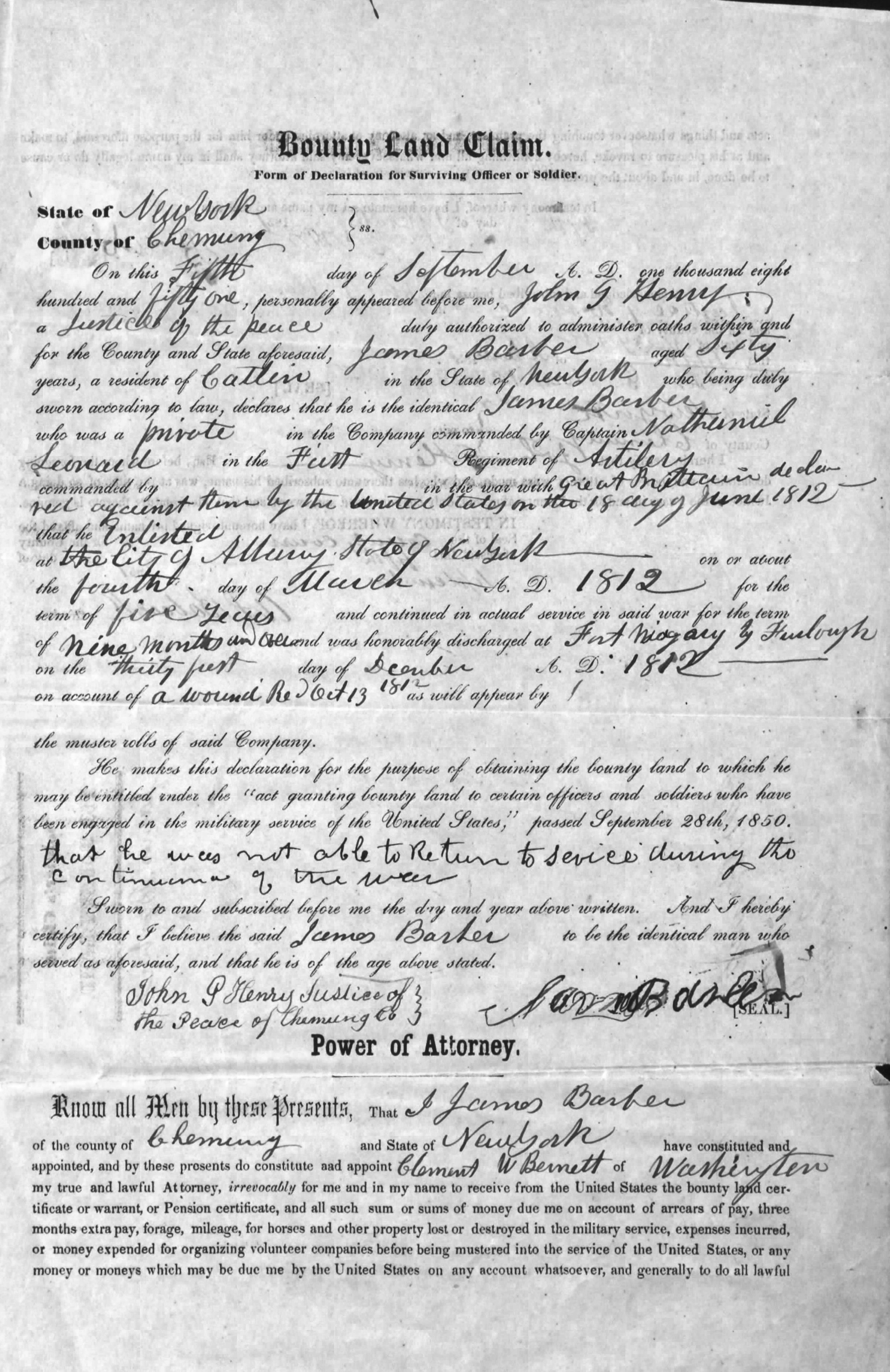 Hand written:State of New York – Chemung County Part 1: On this thirteenth day of April in the year of our Lord one thousand eightheen dred and fiftycame personally before me Patrick Quin (?) a justice of the peace in an of said County Hannah Barberof Catlin in said County who being just duly sworn according to the law says that James Barber of Veteran of said County of Chemung and State of New York is her Son aged fifty nine years and upward,that about the commencement of the war of eighteen hundred and twelve the said James Barber left home, that after a time his father recieved a letter from the said James Barber dated atFort Niagara which letter stated that the said James Barber had Enlisted in the Army of the United States, that after an absence of a year or more said James Barber returned home in Catharine then the County of Tioga (now Chemung) that when he so returned he had a wound in the thick part of his leg below the knee that said Wound mearly crippled him for nine months or more he not being able to straiten his leg and she furthur notes that the wound remained unhealed for nearly four years and she further states that when the said James Barber returned a Mr Smith wo also had a wound in his arm returned with him and the said Smith Have stated that the said James Barber Recieved his wounds at Fort Niagara at the time of the Battle of Queenston and she furthur notes that as the time the said James Returned he has a permission signed by Captain Leonard permitting him the said James to return home until his wound was healed and he again called into service and she further states that the said James Barber resided with her for three years or more immediately after his return and that he was not sufficiently recieved to return to duty until after the war was closed and that said Smith went away ___ _____ he _____ Returned and she does not know where… Part 2: ….the said Smith now resides or whetter his is and she further states that the said James Barber Returned home in the month of December Eighteen hundred and twelve or (January Eighteen hundred thirteen) ( kinda scratched out) HannahherXmarkBarber
