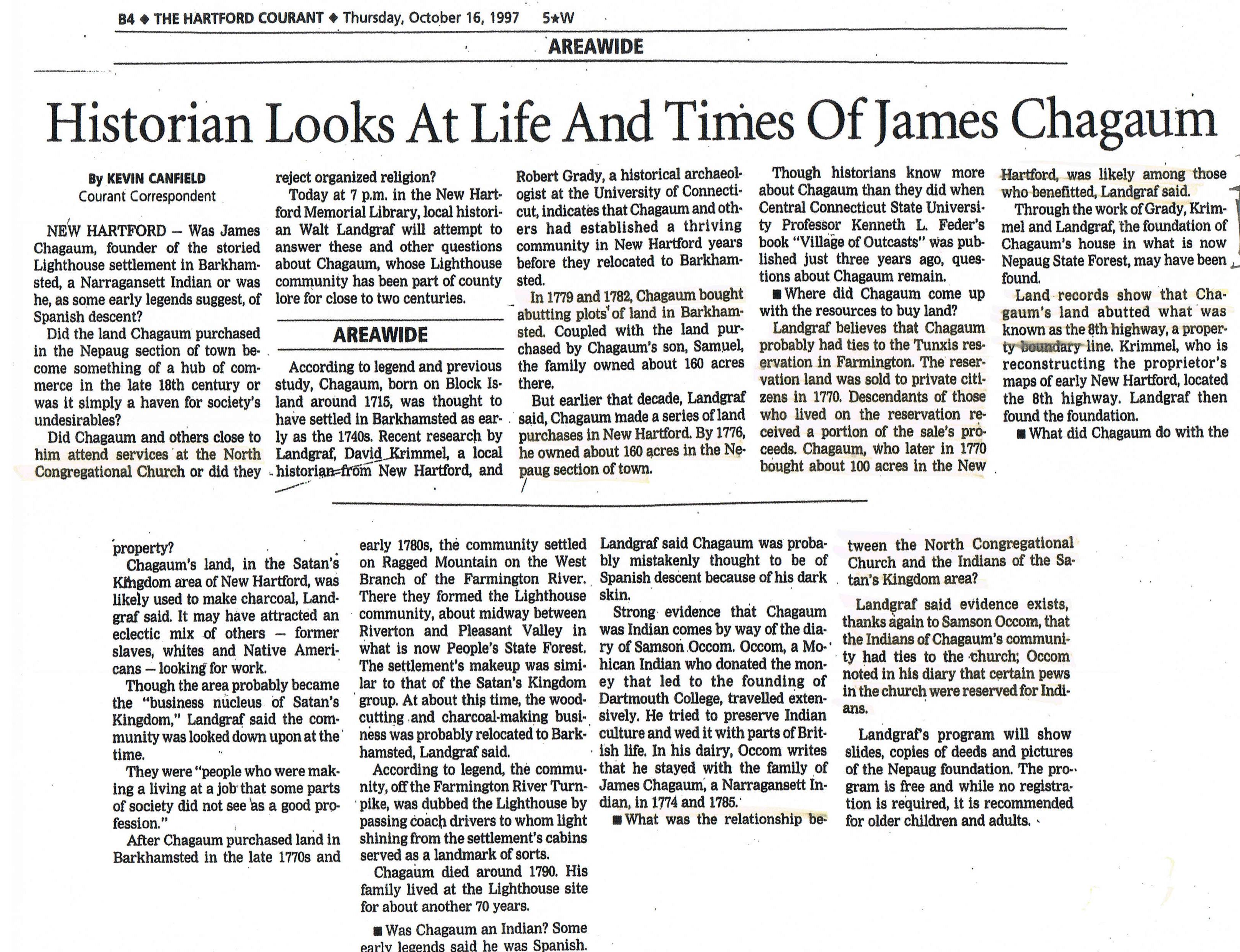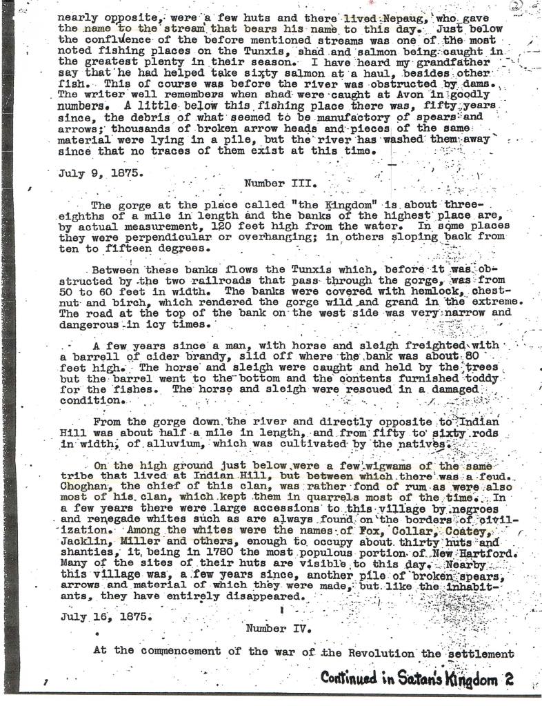 Know all men by these present that I James Chaugon of New Hartford In the County of Litchfield and Colony of Connecticut in New England for for the Consideration of the Sum of Eighteen pounds Lawfull money in ____ ____ Recievd to my full Satisfaction of Oliver Delown of Hebron in the County of Hartford and Coloney afore Sd Do give, grant Bargain Sell Convey & Confirm unto him the said Oliver Delown and to his Heirs and ASsigns foreever one Certain Pe__ or Parcel of Land Lying and being in the Town of New Hartford in the County of Litchfield and is Bounded as followeth viz bounded South of hte heirs of Oliver Lewis ____ and west on the River North on McKight Land & East on a highway and Contains about thirty four acres of Land to have and hold the above granted and Described ________ with the Appurtenances thereof unto him the said oliver Delown and to his heirs and ASsigns to his & there only use benefit and Behold forever and also I the said James Chogum Do for my Self my heirs Escutors and Doministrators Covenant with the Sd Oliver Delown & with his heirs and assigns that at and _____ the Ensealing of these presents I am seized of the promises as a good indefeasable estate in the simple and have good Right to (Bargain-crossed out) ____ __ same in manor & form as is above written & that the same is free from all Incumbrances Whatsoever & furthermore I the Sd James Chogam Do by these presents Bind my Self and my heirs forever to warrant & Defend the above granted and Bargained ______ to him of sd Pliver Belowm and to his heirs ASsigns against all Claims & Demands Whatsoever In witness whereof I have here unto Set my hand and seal this 21st Day of June 1776