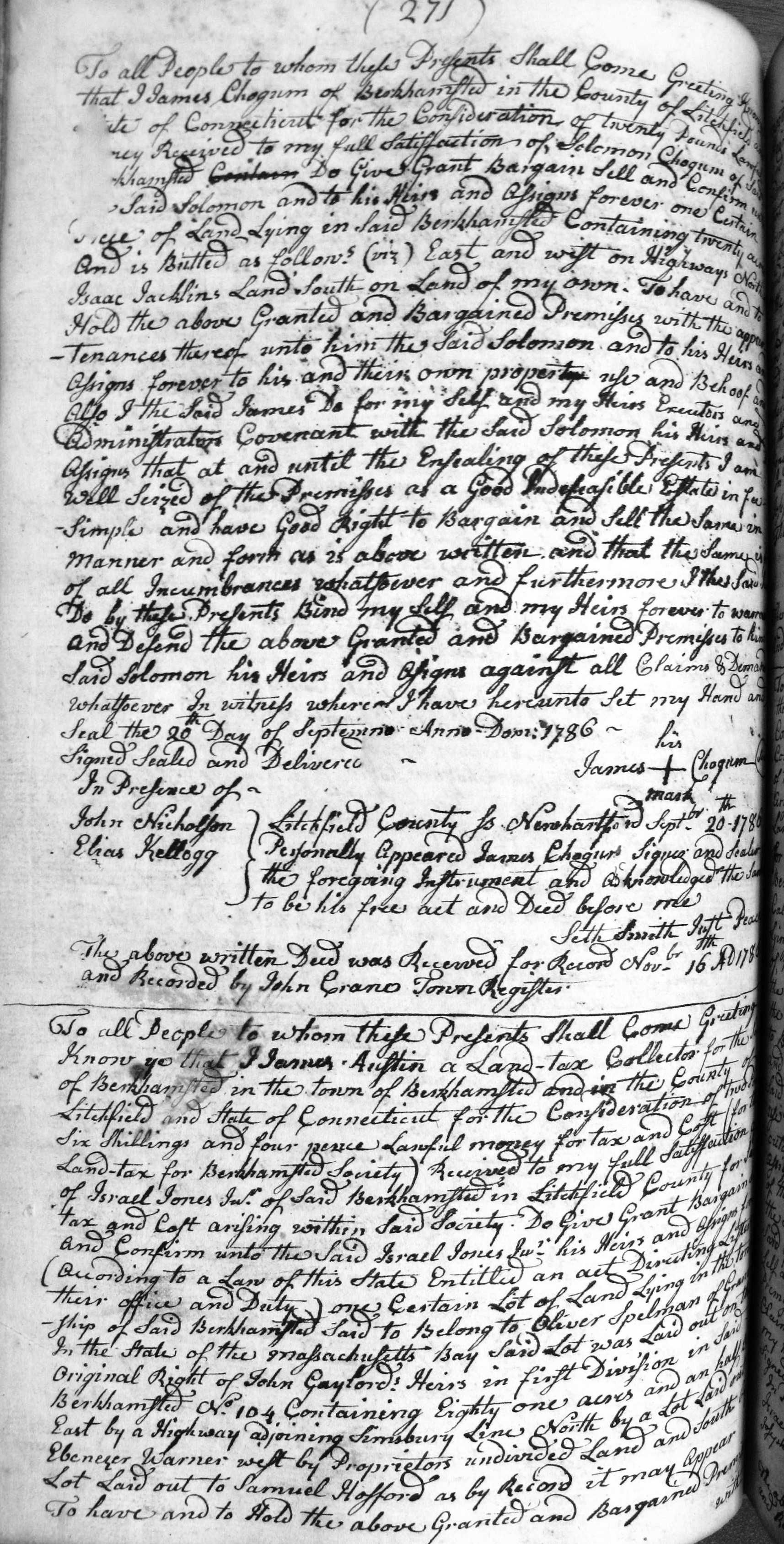 To all People to whom these Presents Shall Come know that I James Chogum of Berkhamsted in County of Litchfield and State of Connecticut for the Consideration of twenty pounds lawful money Received to my full satisfaction of Solomon Chogum of said Berkhamsted Do Give Grant Bargain Sell and Confirm __ ___ Said Solomon and to his Heirs and assigns forever one Certain Piece of Land Lying in Said Berkhamsted Containing twenty acres (?) And is Butted (?) as follows (viz) East and west on Highway North of Isaac Jacklins Land. South on Land of my own. To have and to Hold the above Granted and Bargained Premises with the  app____ – Tenances therefore unto him the said Solomon and to his Heirs and Assigns forever to his and their own property use and Behoof (?) and also I the said James do for my Self and my Heirs Executors and Administrators Convenant with the said Solomon his Heirs and Assigns that at and until the Ensigning of this Presents I am Will Seized of the premises as a Good Ind__easible Estate in ___ – Simple and have good right to Bargain and sell the same in manner and form as is above written and that the same in of Incumbrances whatsoever and futhermore I the said Do by this Presents Bind my Self and my Heirs forever to ___ and Defend the above Granted and Bargained Premises to ____ Said Solomon his Heirs and Assigns against all Claims  __ _______ whatsoever In witness where I have hereunto set my hand a Seal the 20th Day of September Anno Dom: 1786