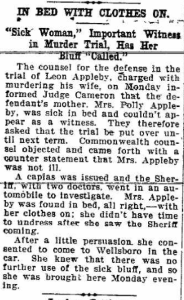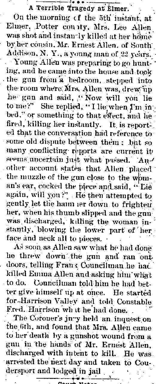 3. Bad Apple– December 1, 1910 MAZIE E (Button) Appleby Wellsboro Gazette, Tioga, PA,Thursday, December 1, 1910 Mazie Appleby came to her death from 2 gunshot wounds at the hands of Leon Appleby, her husband, sometime between 3 & 4 o’clock on the afternoon of Thanksgiving Day. Mazie is the daughter of Mr and Mrs Ellis Button. She married Leon Appleby on December 25, 1909. They made their home in a small house near Shortsville nearly opposite the house of Mr & Mrs Jackson Appleby, the parents of Leon Appleby. Mazie was sitting and feeding child on her lap when Leon Appleby probably approached her from the rear, and without warning fired twice. Blood and particles of flesh were on the wall and furniture surrounding. Bloody fingermarks were found on doors, a newspaper covered with blood and evidently had been used to remove the blood from his hands. Neighbors who entered the house later that afternoon discovered a shocking sight. The body of Appleby’s wife lay on the floor surrounded by pools of blood and the 11 month old baby was playingy around the body, its clothing drenched in Mazie’s blood. The body of Mrs Appleby was laid to rest at Keeneyville last Sunday. The little daughter is being cared for by friends. And this is chapter one in the saddest, most terrible tragedy that has ever been enacted within the peaceful confines of Tioga county. Neighbors said Appleby had been in the habit of coming home drunk and beating his wife. He had been in jail twice this year. Appleby told several different stories as to the cause of his wife’s death, immediately after it occurred. It is said that Appleby on several occasions threatened to kill his wife and child as well as his wife’s parents, but, nevertheless, Mrs. Appleby was finally induced to return to her husband. Case will come to trial in January…The funeral of Mrs. Appleby was held on Sunday, at 1 p.m., at the Chatham Valley church, Rev. Mr. Henderson officiating; interment was made in the Keeneyville cemetery. Deceased is survived by her parents, one sister and two brothers. (also her daughter)