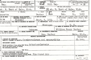 Maryette Barber Obit: was born 09/03/1865 and died 02/14/1953, age 88 yrs. Her father was Levi Clark, her husband William Henry Barber. Informant George Barber of Hale, Michigan. Death certificate said she lived in Hill Twp, Ogemaw Co for 55 yrs. (Note from Coni – need a copy of this obit – only have this reference to it~)