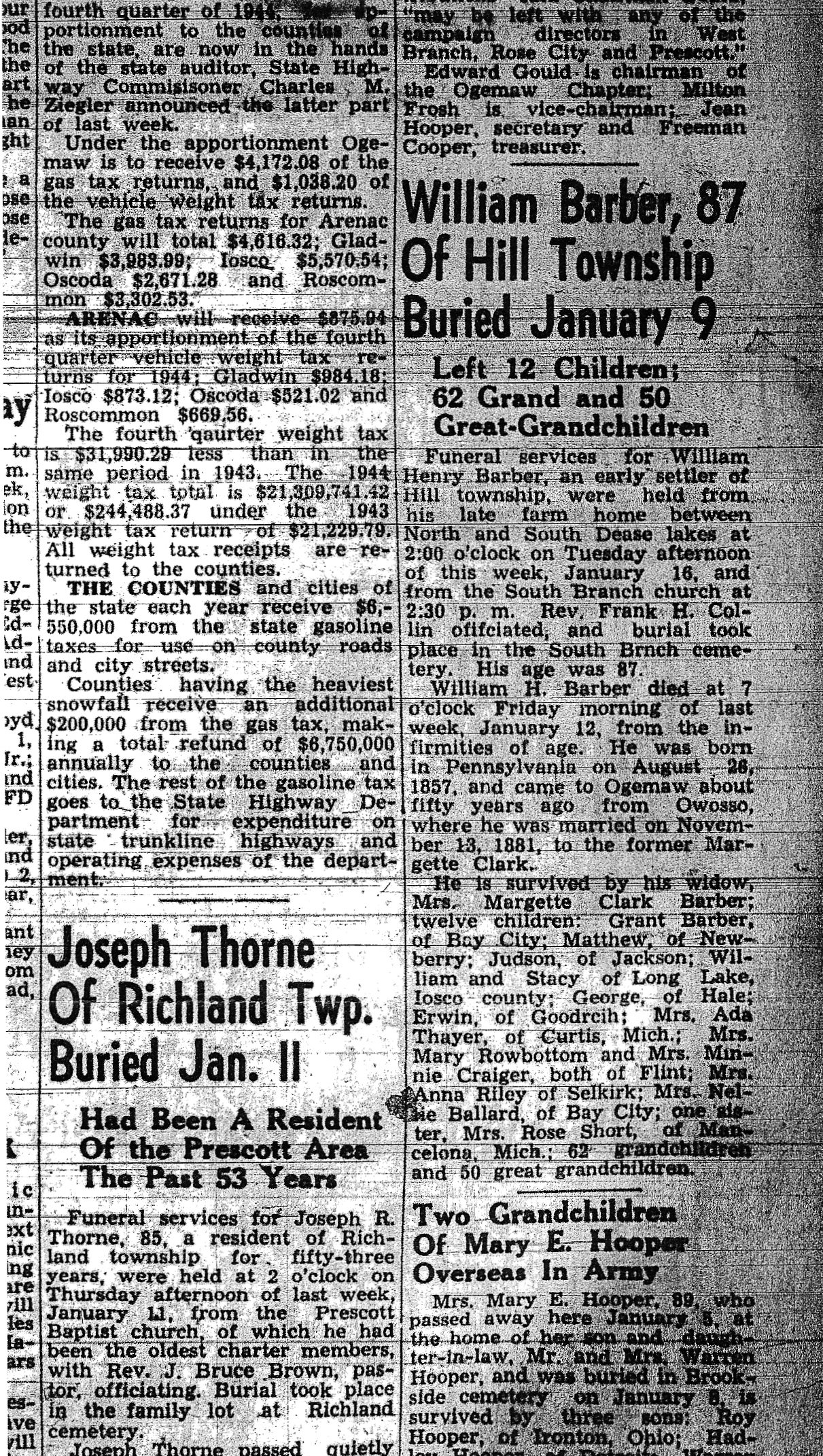 Ogemaw Herald Jan. 18, 1945 – William Barber Obituary – (Penny Carney found this info for us)