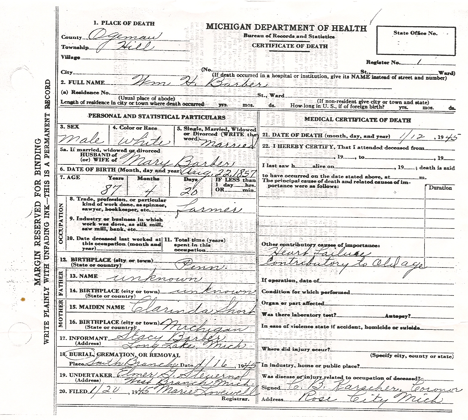 Funeral Services for William Henry Barber, an early settler of Hill township, were held from his late farm home between North and South Dease lakes at 2:00 o’clock on Tuesday afternoon of this week, January 16, and from the South Branch Church at 2:30 P.M. Rev. Frank H. Collin Officiated, and burial took place in the South Branch Cemetery, His age was 87. William H. Barber died at 7 o’clock Friday morning of last week, January 12,  from the infirmities of age. He was born in Pennsylvania on August 26, 1857 and came to Ogemaw about fifty years ago from Owosso, where he married on November 13, 1881, to the former Margette Clark. He is survived by his widow, Mrs. Margette Clark Barber; 12 children; Grant Barber of Bay City;  Matthew, of Newberry; Judson, of Jackson; William and Stacy of Long Lake, Iosco County; George, of Hale; Erwin, of Goodrich; Mrs. Ada Thayer, of Curtis, Mich.; Mrs. Mary Rowbottom and Mrs. Minnie Craiger, both of Flint; Mrs. Anna Riley of Selkirk; Mrs. Nellie Ballard, of Bay City; one sister Mrs. Rose Short, of Mancelona, Mich.; 62 grandchildren and 50 great grandchildren.