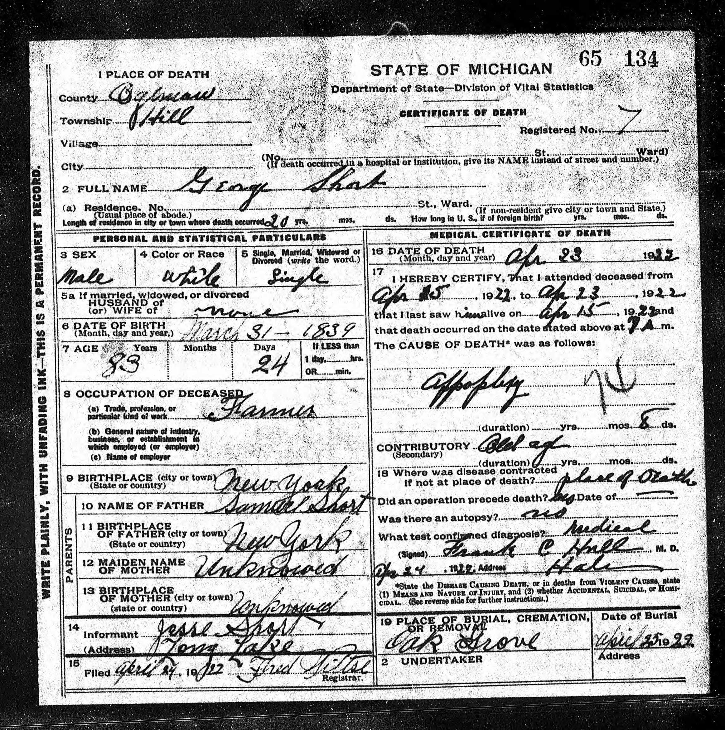 George Washington Short Death Certificate