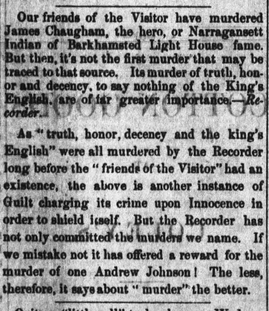 One thought on “Our Friends of the Visitor have murdered James Chaugham, the hero, or Narragansett Indian of the Barkhamsted Light House fame.