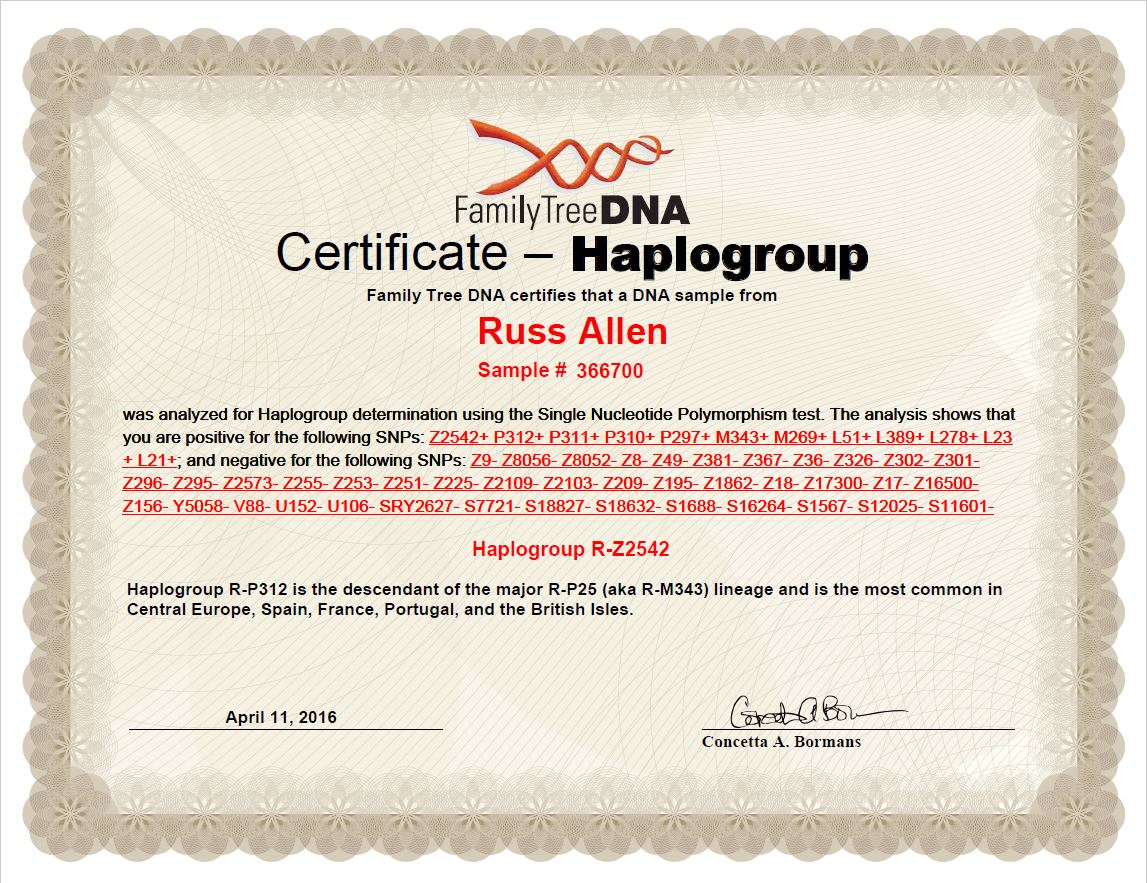 Russ Allen’s FTDNA Haplogroug Certificate – Kit 366700